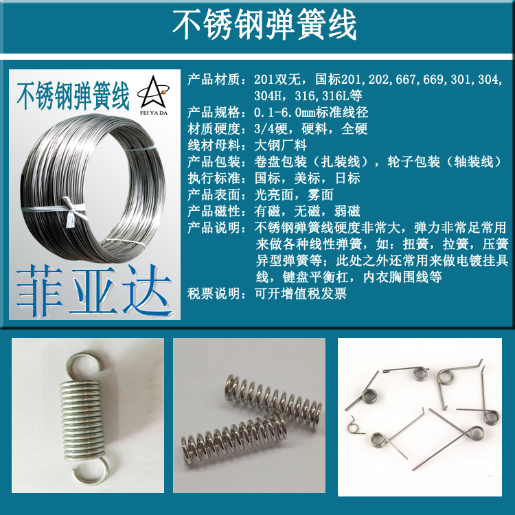 1.原料有保證:菲亞達不銹鋼霧面彈簧線用的是寶鋼不銹鋼6.0mm的不銹鋼霧面線拉絲而成的,它的材料完全符合我國和美國,日本等國家的不銹鋼材料標準;所用的拉絲有也完全符合拉絲油的環保標準;線材及成品可以放心出口日本,美國,韓國,歐盟等國家;